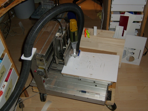 Welcher Modellbauer träumt nicht davon eine eigene CNC-Fräse zu besitzen? Im Bereich Modellbau ist diese aus dem Alltag nicht mehr weg zu denken, auch wenn der Weg bis zum heutigen Stand ein nicht ganz leichter war. Als Dauerleihgabe der Gemeinde Lohmen haben wir Mitte 2011 eine CNC-Fräse erhalten, welche leider in der geschlossenen Mittelschule seit Jahren vor sich hin staubte. Zum Zeitpunkt der Übernahme lief die Maschine unter MS-DOS und war in diesem Zustand kaum zu gebrauchen. Über den Winter 2011/2012 wurde die Fräse demontiert und mit neuen Komponenten aufgerüstet. So erhielt sie unter anderem ein neues Netzteil, eine neue Frässpindel, eine neue Schrittmotorensteuerkarte und Endlagenschalter. Dies ermöglicht uns seit Anfang 2012 Projekte bis zu einer Größe von A4 zu fräsen.