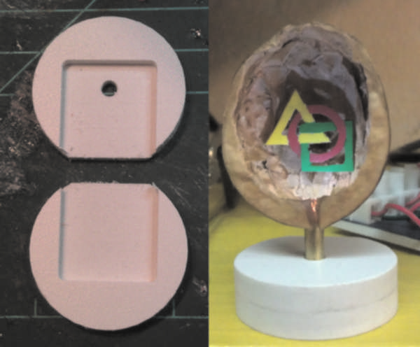 Mal wieder eine kleine Sache aktuell zur Jahreszeit. So lieferte die Fräse die beiden Teile für den Walnusshalter. Im Fuss versteckt sich eine 3 Volt Batterie, welche das Innenleben der Walnusshälfte zum Erleuchten bringt. In diesem Fall das Logo des "mit-denken" e.V., die als Erstes entstand. Aufgrund der Begeisterung wurden aber schon mehrere Mini-Firmen-Werbe-Nüsse angefertigt.