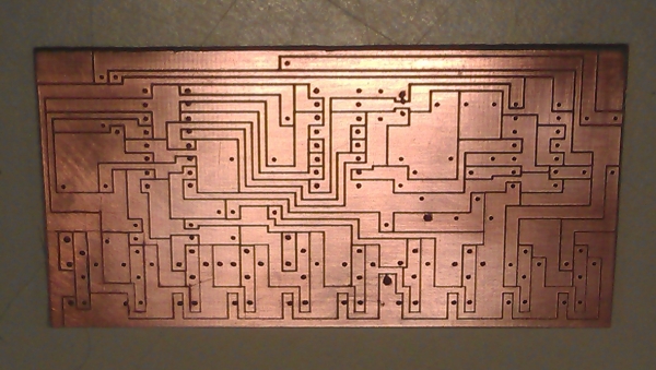 Das erste Projekt, welches realisiert wurde, waren die Platinen für unsere Flasher. Für den Messeauftritt im Februar 2012 mussten ca. 200 Flasherplatinen gebohrt werden. Um eine Menge Zeit zu sparen lag es natürlich nahe, dies mit der Fräse umzusetzen. So wurden nach ersten Versuchen und der anschließenden Feinabstimmung die 64 Bohrungen in die selbst geätzten Platine automatisch gebohrt.
