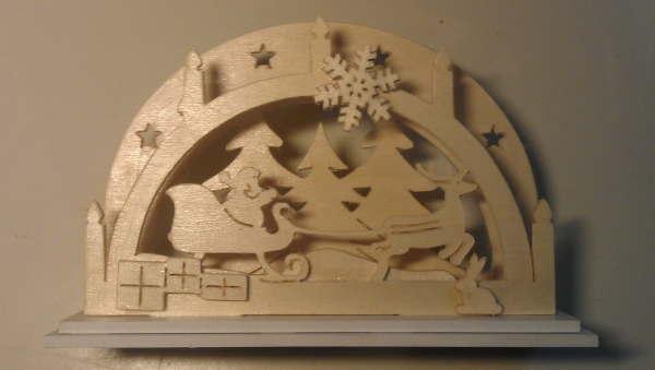 Der Schwibbogen entstand als Versuch einen Bausatz herzustellen, der in kurzer Zeit auf Festen um die Weihnachtszeit mit Kindern gebastelt werden kann. Die 2 Sperrholzbögen und die 2 Fußteile aus Forex werden durch die Fräse hergestellt und müssen anschließend nur noch geschliffen, lackiert und zusammen gesteckt werden. Danach kommt noch eine Glühlampe zwischen die 2 Bögen, ein Batteriefach und ein Schalter an die Rückseite und 3 Kabel die das ganze verbinden.