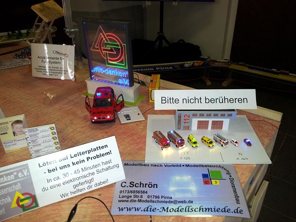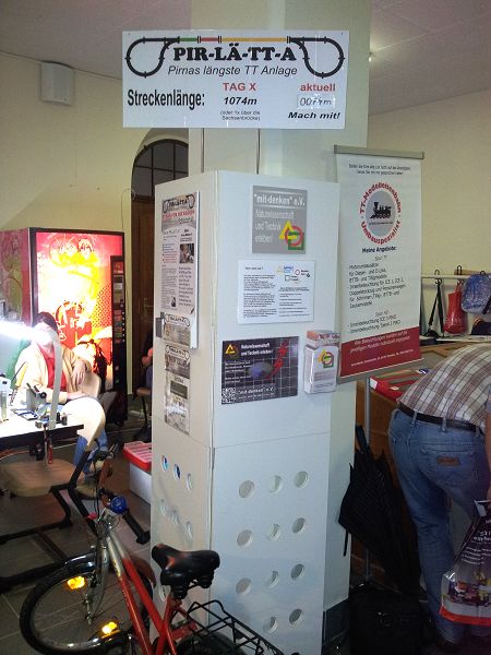 Am 8. und 9. Juni 2013 waren wir eingeladen unser Projekt zum TT-Clubtreffen in Sebnitz mit unserem Messestand zu präsentieren. Platzmäßig etwas eingeschränkt, konnten wir ca. 5m der PIR-LÄ-TT-A "laufen lassen", was Dank der neuen Ständerelemente aus dem Berufsschulentrum Technik Pirna auch zuverlässiger denn je funktionierte. Weitere METER unserer Sponsoren waren an unserer Schauwand zu sehen. Kinder nutzten immer wieder die Möglichkeit die kleine Lok über die Strecke zu jagen.