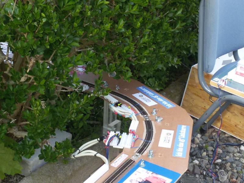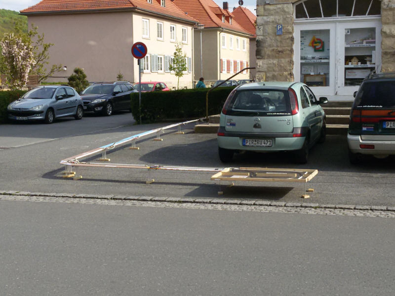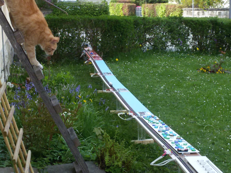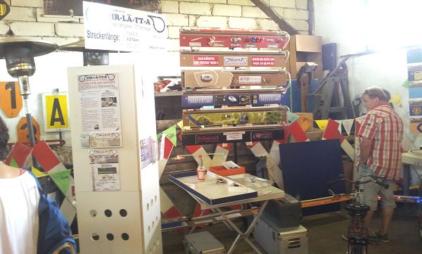 Am 5. Mai 2016 zum Himmelfahrtstag fand der jährliche Testaufbau unseres Rekordversuches statt. Das bedeutet, alle Module welche wir in der Werkstatt lagern, und einige Weitere, welche wir von den "METER-Besitzern" draußen extra für diesen Tag zu uns holen, werden zu einer Gesamtstrecke zusammengebaut. Tage vorher wird jeder einzelne METER, jedes Kurvensegment und das Steuermodul gesichtet, gereinigt und evtl. repariert. Das alles ist natürlich ohne Hilfe nicht mehr machbar. Daher ganz besonderen Dank an Patrick, Richard, Roland, Marko und Carsten. Dieses Jahr ergab sich eine Gesamtstrecke von exakt 92,12 Metern. Einmal ums halbe Haus, und dann vor dem Haus noch einmal "gefaltet".
