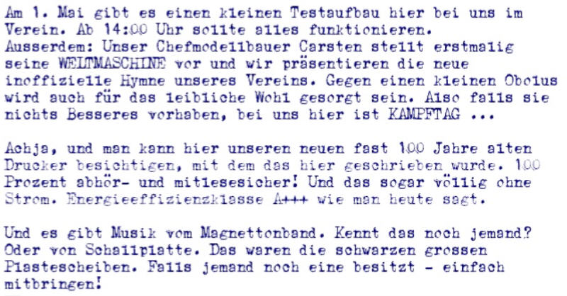 Das Ergebnis eher verhalten. War wohl etwas kurzfristig, und in unmittelbarer Nähe das DDR-Museum mit seinen jährlichen 1.Maifeier natürlich eine Riesenkonkurrenz. Egal. Wir hatten unseren Spass und alles aufgebaut was ging.