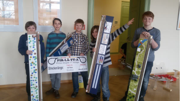 Den bisher schönsten und größten Auftritt durften wir mit Hilfe des Jugendrings Sächsische-Schweiz - Osterzgebirge e.V. erleben. Auf dem Pirnaer Untermarkt präsentierten wir zum ersten Mal unsere Weltmaschine, ca. 30 m unserer PIR-LÄ-TT-A und unser neues Vereinsmaskottchen. Außerdem überreichten wir Vertretern der Kleinkunstbühne Q24 ein PIR-LÄ-TT-A-Modul als Dankeschön für die Unterstützung in den letzten Jahren.