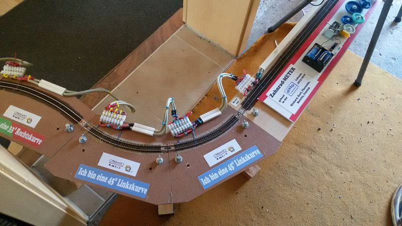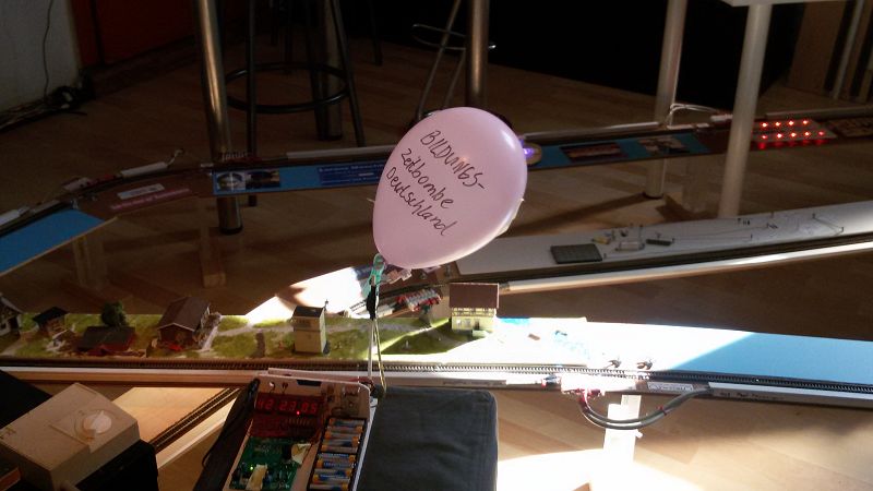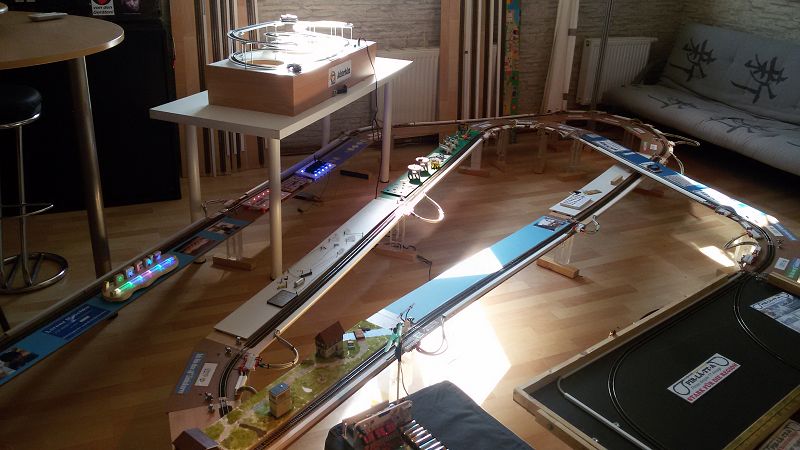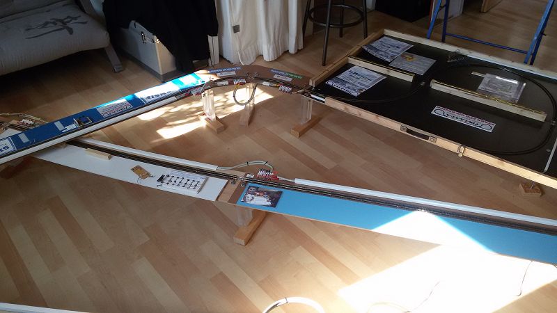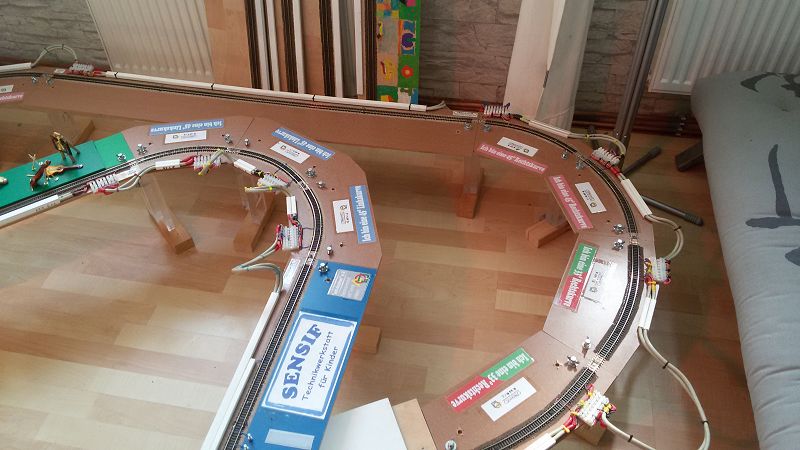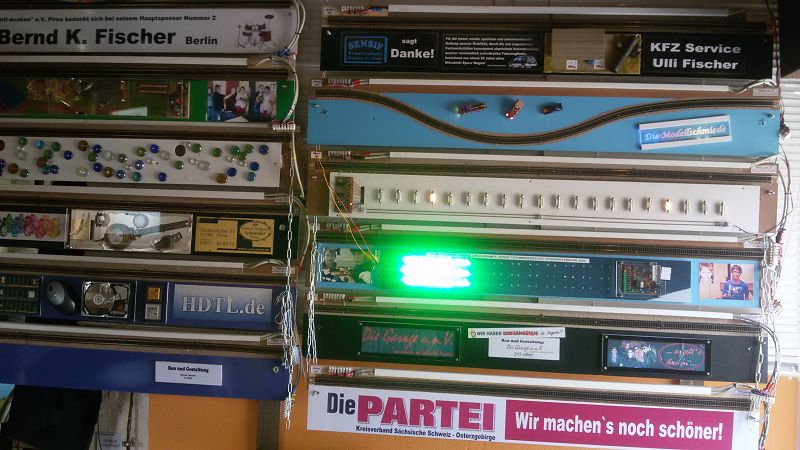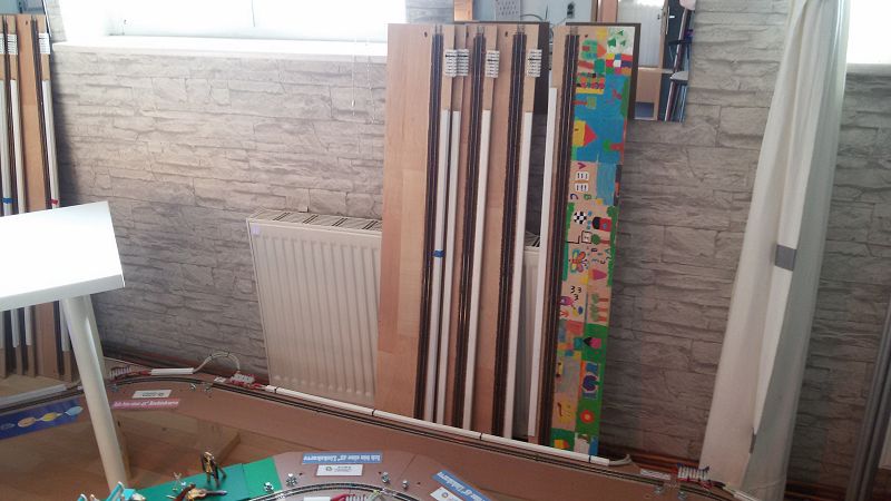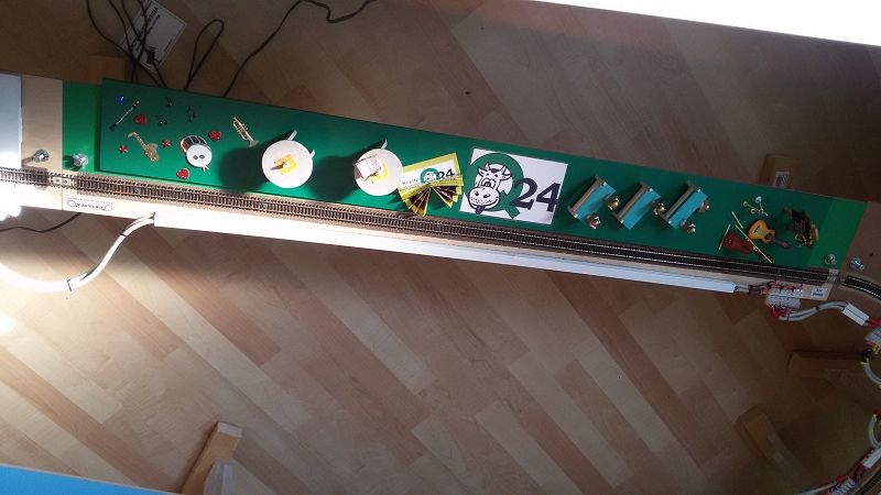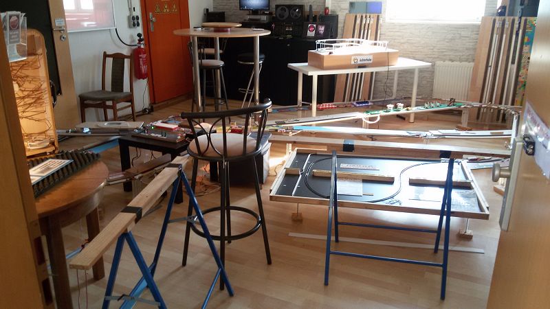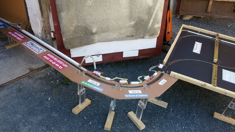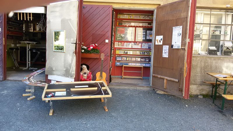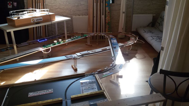 Dieses Jahr haben wir zum ersten Mal überhaupt wirklich bis zur letzten Kurve alles zeigen können was existiert. Das zwang uns aber zu Kompromissen. Erstens müssten wir inzwischen den Straßenverkehr hier im Viertel einschränken, zweitens wollten wir diesmal nicht nur einen Tag alles zeigen, sondern eine Woche lang, und drittens war das Wetter eher so ... naja ... bescheiden. Also kam nur eine Indoorvariante in Frage. Unser Dachverband D.G.u.n.V. sprang uns wie schon zum Kurzfilmtag 2015 hilfreich zur Seite. So brachten wir doch die gesamten 130 Meter unter. Der größte Teil hing zwar an den Wänden, trotzdem ging die Tour vom Hof durch die GARAGE, und endete in einer Art Achterbahn im Studio. Vielleicht werden wir ja in Zukunft wieder mal eine Gelegenheit finden, das Gesamtwerk im Geradeauslauf zeigen zu können ...