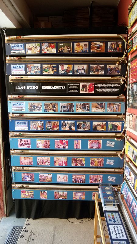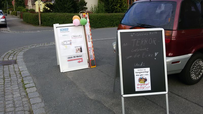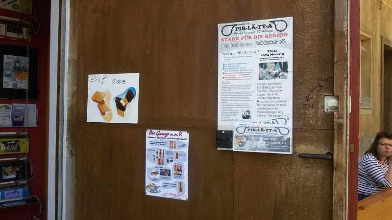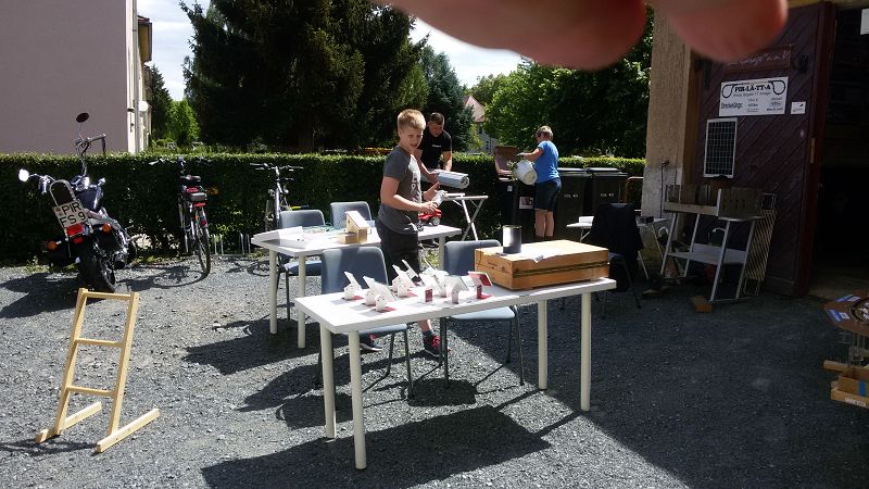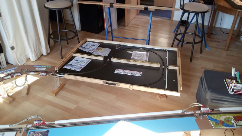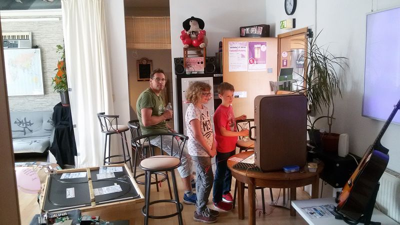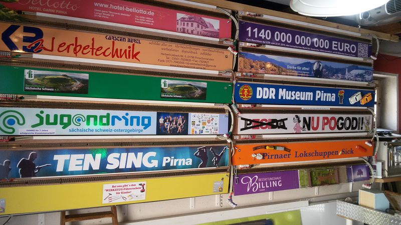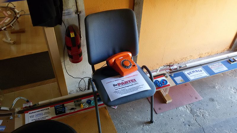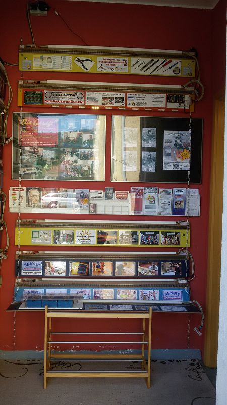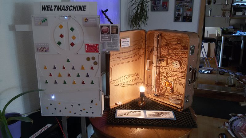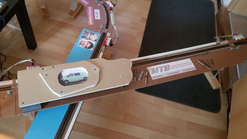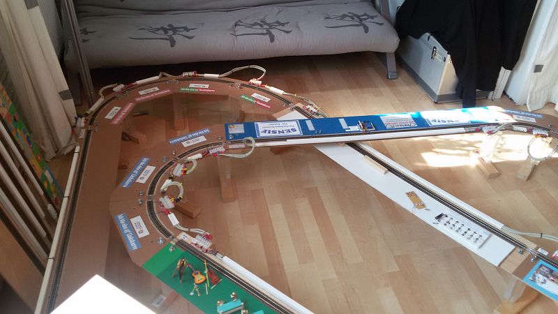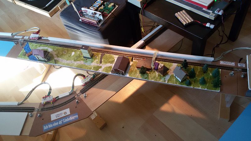 Dieses Jahr haben wir zum ersten Mal überhaupt wirklich bis zur letzten Kurve alles zeigen können was existiert. Das zwang uns aber zu Kompromissen. Erstens müssten wir inzwischen den Straßenverkehr hier im Viertel einschränken, zweitens wollten wir diesmal nicht nur einen Tag alles zeigen, sondern eine Woche lang, und drittens war das Wetter eher so ... naja ... bescheiden. Also kam nur eine Indoorvariante in Frage. Unser Dachverband D.G.u.n.V. sprang uns wie schon zum Kurzfilmtag 2015 hilfreich zur Seite. So brachten wir doch die gesamten 130 Meter unter. Der größte Teil hing zwar an den Wänden, trotzdem ging die Tour vom Hof durch die GARAGE, und endete in einer Art Achterbahn im Studio. Vielleicht werden wir ja in Zukunft wieder mal eine Gelegenheit finden, das Gesamtwerk im Geradeauslauf zeigen zu können ...
