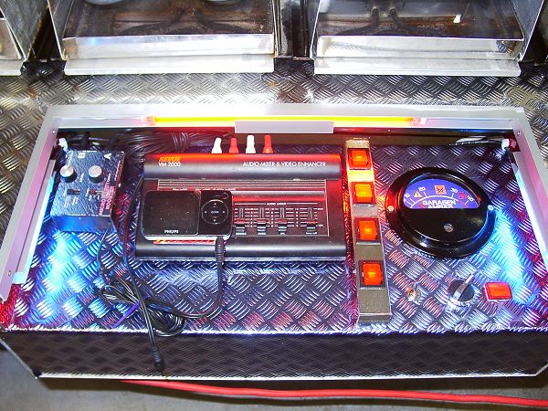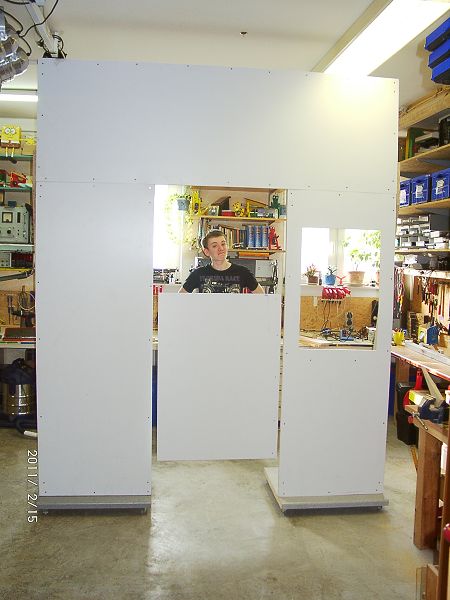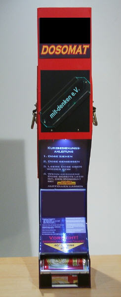 Ein "Getränkedosenspender" zusammengeschraubt aus dem was so herumlag. Ein paar Batterien, Leuchtdioden,Griffe dran und beklebt mit selbst gestalteter Bedienungsanleitung. Als außergewöhnliches Geschenk zum Jubiläum eines Vereinsmitgliedes. Zum Aufstellen, an die Wand hängen oder als Tragerucksack bei Familienausflügen. Bestückbar mit bis zu 32 Stück 0,5 Liter Getränkedosen (hier Bier) und dementsprechend schwer. Nicht ganz ernst gemeint, kam aber gut an ;-)