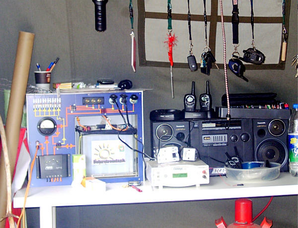In einem alten PC-Gehäuse fand die Technik für unsere Outdoor-Stromversorgung Platz. Gespeist durch bis zu 3 große Solarpaneele liefert sie uns durch eingefangene Sonnenenergie genug Strom um den Energiebedarf für unsere Veranstaltungen im Freien zu decken. Vor allem in unserem Natur- und Technik-Camp im Sommer ist sie Herzstück unserer Energieversorgung.