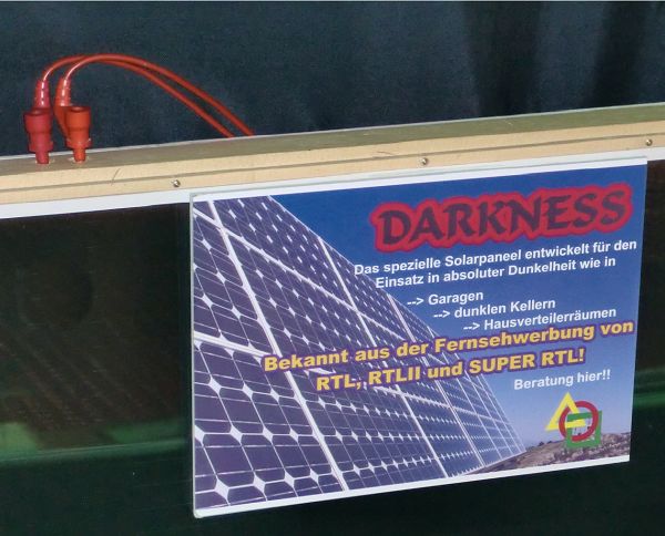 Ein 2,00 m x 1,00 m großes und mörderschweres 8,00 cm dickes Solarpaneel, von unserer Forschungsabteilung speziell entwickelt für den Einsatz in dunklen Räumen wie Garagen, Hobbykellern oder Hausverteilerräumen. Highlight bei jeder Ausstellung von uns. Und ob man es glaubt oder nicht, wir wurden nicht erst einmal nach dem Preis gefragt!!